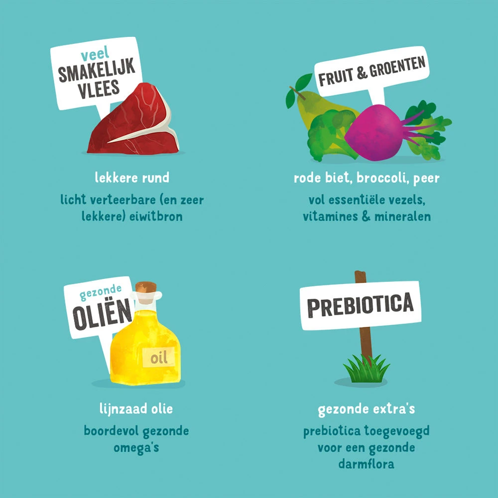 - Met rund als licht verteerbare proteïnebron en ter ondersteuning van de spieren
