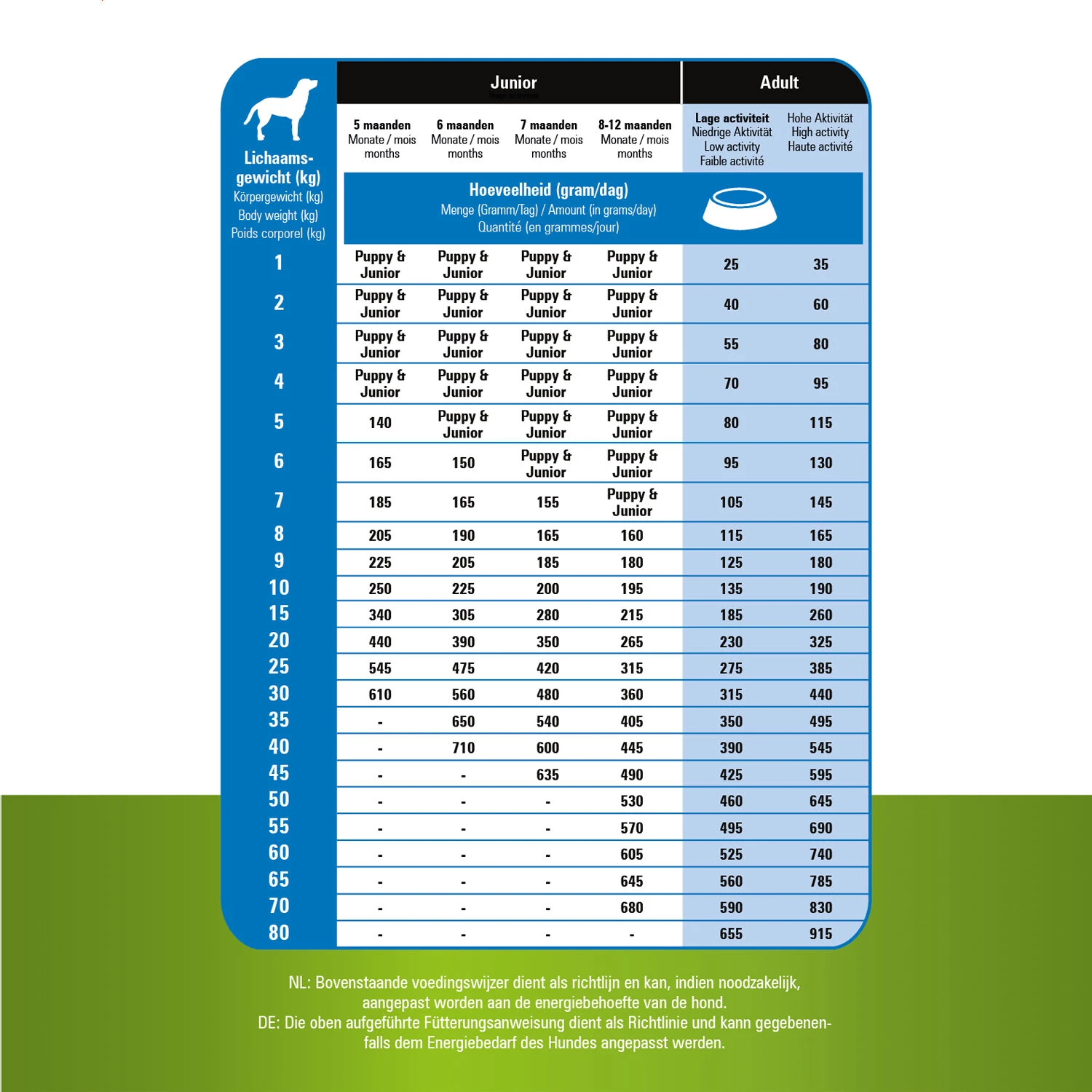 - Graanvrije voeding met een verhoogd vetgehalte voor actieve, drachtige of zogende honden
