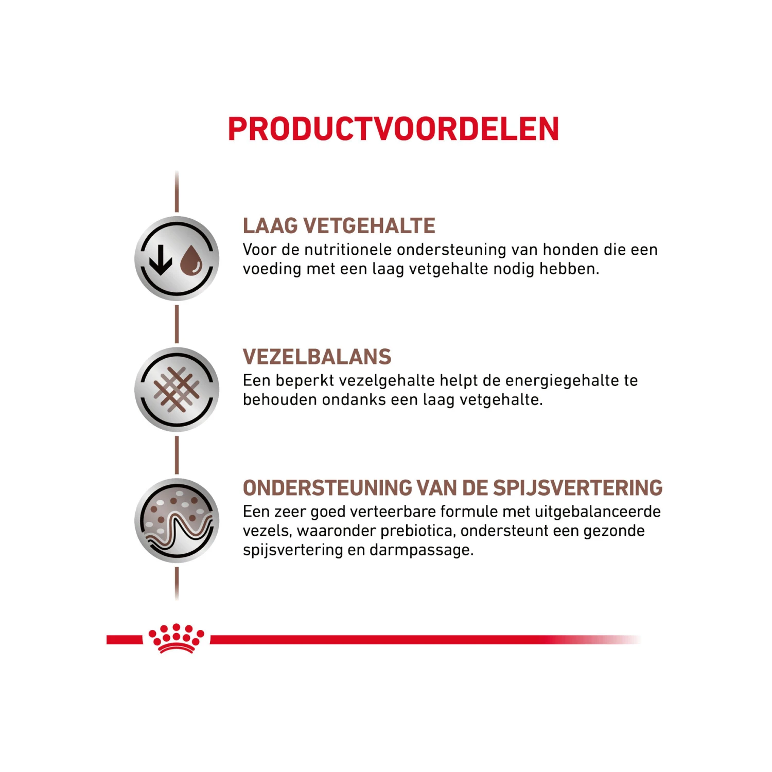 Voor grotere rassen is er Royal Canin Gastrointestinal Low Fat Hond.