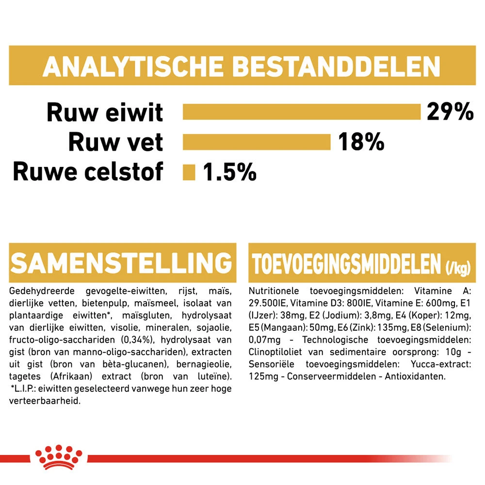 Gedehydreerde gevogelte-eiwitten, rijst, maïs, dierlijke vetten, bietenpulp, isolaat van plantaardige eiwitten, maïsmeel, maïsgluten, hydrolysaat van dierlijke eiwitten, mineralen, visolie, sojaolie, Fructo-Oligo-Sacchariden, hydrolysaat van gist (bron van Manno-Oligo-Sacchariden), bernagieolie, tagetes (Afrikaan) extract (bron van luteïne).